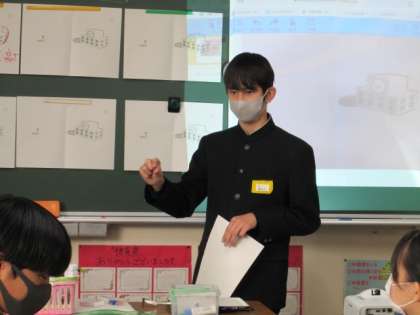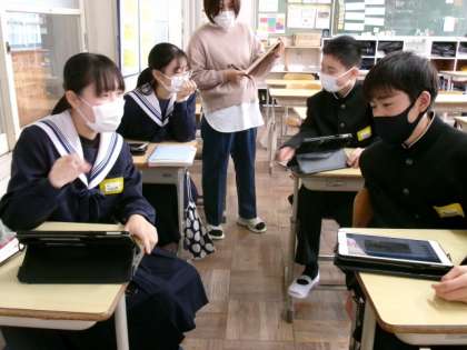 2時間目に、3年生数学の少人数授業で研究授業を行いました。校舎の高さを求める方法について、話し合いました。相似や比を使った方法、校舎と人間の影を活用する方法、屋上から球を落として時間を測って求める方法などが各グループから出され、全体で共有しました。