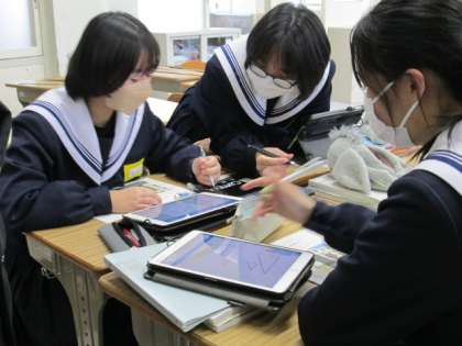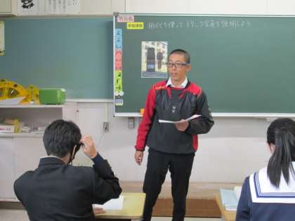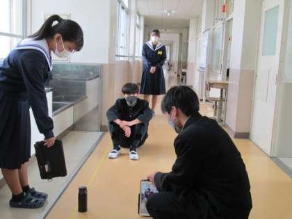 4時間目に、3年生数学の少人数クラスで研究授業を行いました。「先生と水筒が同じ高さに見える写真」が提示され、水筒と人間がどれだけ離れたらトリック写真が撮影できるかを考えました。水筒や先生の高さ・身長を測ったり、水筒と人間の距離を導くのに必要な数値は何かを考えて先生に尋ねたりしながら、班員と協力しながら課題解決をしていきました。時間の経過とともに、考えるヒントとして、先生は学習用タブレットにヒントカードを送り、解けたグループは「気づきメモ」に自分たちの考えを書き込み、全員で共有しました。その後、グループで協力して新たなトリック写真の撮影にチャレンジしました。