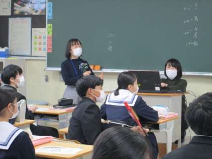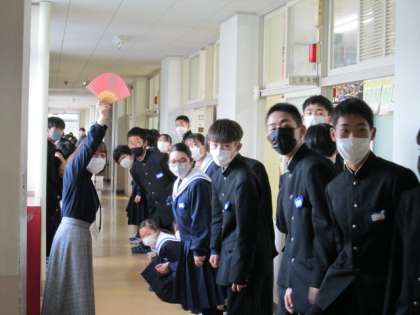 本校では毎週火曜日に学校図書館司書が勤務し、学校図書館業務や昼放送で本の紹介などをしています。授業にも参加することがあり、現在、2年生の「扇の的(平家物語)」の学習で学習支援を行っています。物語の時代背景を語ったり、船の上の扇を射落とす場面を体感できるように廊下で距離感を体感させたりしていました。