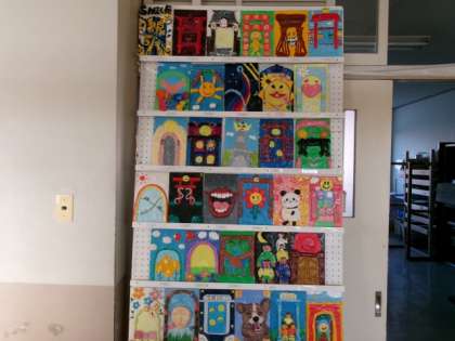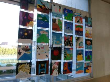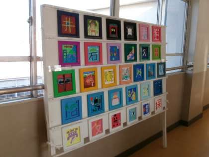 各教室横の廊下には、美術の授業でつくった生徒作品が展示されています。三者面談でお越しの際にご覧ください。