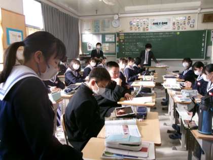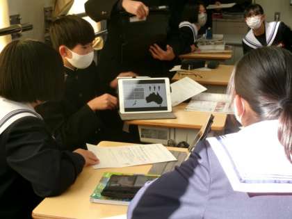 1年生社会の授業では、オセアニア州について学習しています。今日は、オセアニア州の多文化社会に関する課題を、移民の受け入れに焦点をあて、資料や話し合いから考察しました。「教科書のこの部分を根拠に」「根拠なる資料をTeamsに送ります」「調べた内容を自分でまとめた資料を見てください」「実際にオセアニアに住んでいる人の証言があります」。意見交流の場面で聞かれたこれらの発言に驚き、感心しました。学習の振り返りを行うと、友達の意見を聞いて考えが変わったり、深まったりした生徒が多く、授業の学びをSDGsのゴールに関連付けたいと伝える生徒もいました。