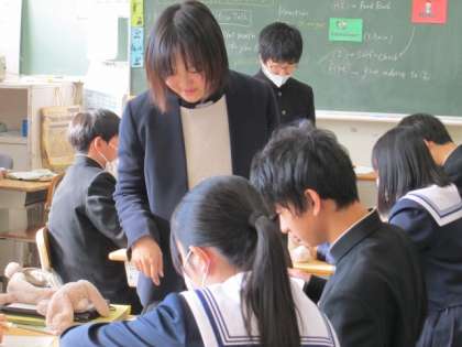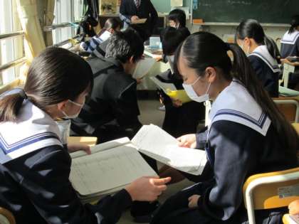 2年生英語の「比較級や最上級を使ってクラスで人気のあるもののアンケートを取りポスターセッションしよう」という単元で、研究授業を行いました。前時までとは違うグループを組み、プレゼンターがアンケート結果を示しながら発表をし、インタビュアーが質問します。グループの仲間からの評価は、自分の発表内容を見直すことに生かします。同じ活動を数回繰り返す中で出た、便利な表現や真似しやすい表現を全体で共有していました。
