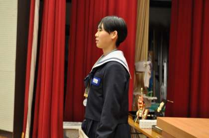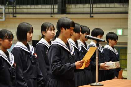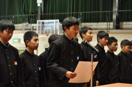 明朝、全校集会を予定していましたが、冷え込むことが予想されたので、本日の5時間目に変更しました。最初に、教育委員会表彰、ソフト部・野球部の表彰伝達、ライオンズクラブ表彰、科学研究・図画コンクール・作文・英語暗誦大会・各種書道作品の表彰を行いました。続いて、海外派遣生徒と韓国派遣教員の研修報告と2年生代表生徒の意見発表を全校で聞きました。校長からは、「頑張る人を応援し、感謝の思いをカタチにすること」「心配ないからね。あなたは大丈夫」という2点を話しました。その後、校歌合唱をし、生徒指導主事の楽しいお話で、今年最後の全校集会を終了しました。