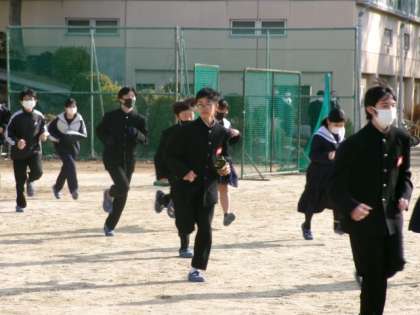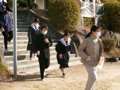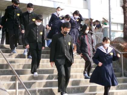 1月15日(月)、避難訓練を実施しました。今回は、防災担当教諭の提案で、いつ行うかは事前に通知せず、突然、緊急放送を入れて避難をしました。2時間目の授業開始数分後に放送が入り、生徒たちは教科担任の指示でグランドへ避難しました。校長と防災担当教諭からは、1月1日の地震および1月2日の飛行機火災にふれて話をしました。地震の揺れはすぐにおさまり、建物は壊れないという認識は通用しないケースがあること、被害を減らすための事前準備、緊急時こそ乗務員などの指示に従って冷静に行動することの大切さなどを、生徒に伝えました。