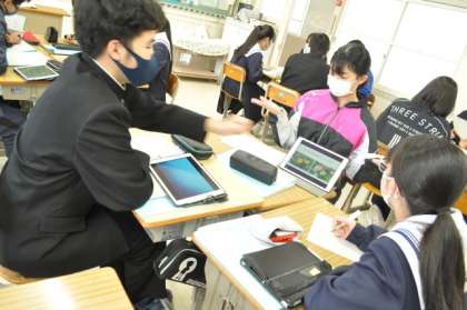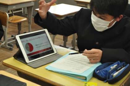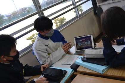 1月18日(木)の午後の様子です。3年生はSDGsについて自分が決めたテーマに沿って学び、まとめてきた内容を、パワーポイントの資料で示しながら仲間と伝え合いました。2年生は、5時間目に自然教室のスキー研修班ごとに分かれて、班長決めや必要事項の確認をし、6時間目はタブレットのアプリを活用して高校調べを行いました。1年生は、SDGsに取り組んでいる企業の方の話を受け、自分にできる取り組みをまとめたプレゼンづくりをしていました。