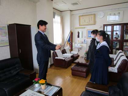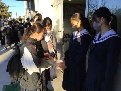 1月16日から3日間行った能登地震で被災された方々への募金活動の結果、10万円を超える支援金が集まりました。このお金は、日本赤十字社を通して復興支援に使われます。先日、福祉委員より全校生徒へお礼の放送が入り、今日は校長室に代表生徒が報告にきてくれました。