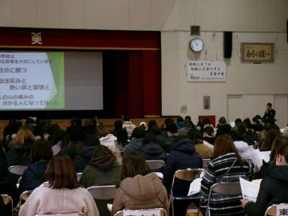 1月24日(水)の午後、令和6年度新入生の保護者を対象にした「入学説明会」を実施しました。雪交じりの寒い日でしたが、多くの方が参加してくださいました。校長挨拶に続き、中学校生活や集金・保健関係についてお伝えし、最後には本校に勤務するスクールカウンセラーから、「中1ギャップ」と「思春期」について話をしました。