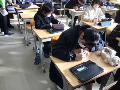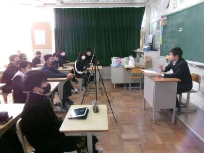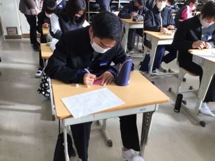 1月29日(月)5時間目、3年生は進路指導主事からの話を聞きました。一クラスの前で進路指導主事が話している様子をオンラインでつなぎ、他のクラスは各教室で話を聞いていました。2年生は、先週の金曜日、自然教室の取組として、今後の決意をしたためていました。桜の花びらの形をした用紙に自分の思いを書き込み、桜の木にして掲げるようです。