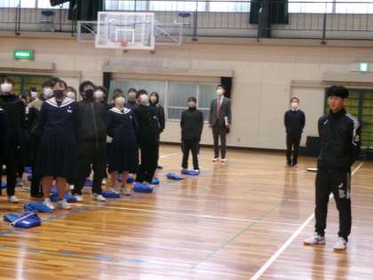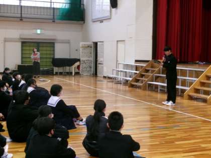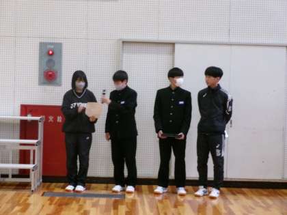 自然教室の3日目、学校への帰着時は雨模様であったため、帰着式を本日の5時間目に実施しました。今回の自然教室では、司会や代表として話す生徒が大変立派であったことが印象的でした。