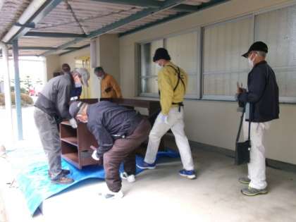体育館の靴箱が古くなり、まだ使えるものは色を塗り直して使用しています。あと、取替が必要なものが一つ、修繕が必要なものがもう一つ残っていました。そこで、美里交流館で活動されている「美里もっこうクラブ」の皆さんに相談したところ、製作と修繕を引き受けてくださいました。3月2日(土)、新しい靴箱が完成し、美里もっこうクラブの6名の方が来校され、取り付けてくださいました。部活動を終えたバレーボール部がお礼を伝え、一緒に記念撮影をしました。窓にかからない高さで、とても素敵な靴箱です。本当にありがとうございます。