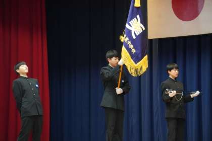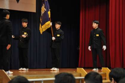 3月4日(月)、旗手の引継ぎ会を行いました。3年生の旗手から2年生の新たな旗手に校旗と思いが渡されました。旗手の練習は、朝早く体育館で行っています。その姿を見ることはほとんどありません。そんな影の努力が式典に花を添えています。