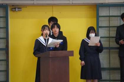 3月15日(金)の午後、全校生徒が体育館に集まり、まず、詩や標語、ポスター、書き初めなどの作品が優秀だった生徒の表彰を行いました。続いて、生徒会役員選挙が選挙管理委員の司会で進められました。立候補者は工夫の凝らしたパワーポイント資料を大型スクリーンに示しながら、堂々と自分の思いを伝えていました。