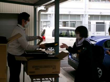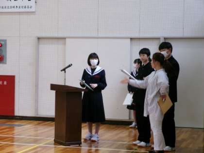 朝、1年生が美術で使用する「デザインセット」を体育館テラスで購入していました。目を体育館の中にうつすと、新入生歓迎会のリハーサルを2・3年生の関係生徒が行っています。
