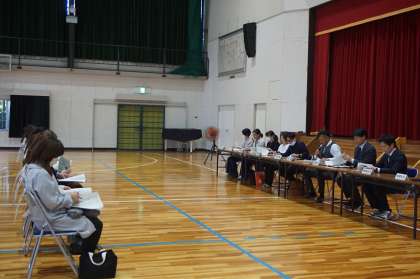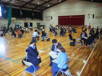 授業参観の前に、3年生の保護者対象の進路説明会を実施しました。3月に続き、2回目で、希望された方が参加しました。また、授業参観後には、育友会理事会を行いました。本校の育友会は、保護者の皆様の負担軽減のため、第1回理事会をもって総会にかえています。理事会終了後、地区理事と地区の代表生徒・地区担当の教員が、顔合わせを行いました。今後、地域行事への生徒の参加などについて、区長さんと連携しながら進めていきます。