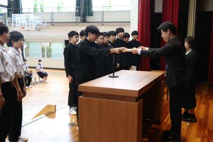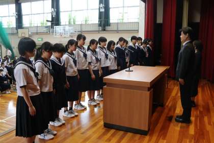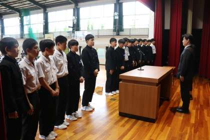 6時間目に全校集会を行いました。まず、部活動の表彰伝達をし、級長・議員・生活委員・委員長の認証へと続きました。その後、主張作文の優秀者2名が、全校の前で発表しました。表彰や認証の返事はとても爽やかで、主張作文発表は堂々とした様子でした。大変立派な姿が見られた全校集会でした。