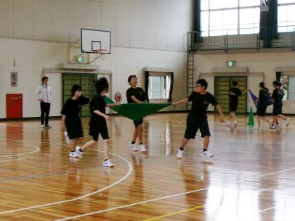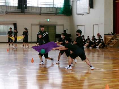 体育の授業では、体育祭種目の練習が始まっています。写真は、1年生が学年種目の練習を行っている場面です。今日はあいにくの雨で、体育館での練習となりました。
