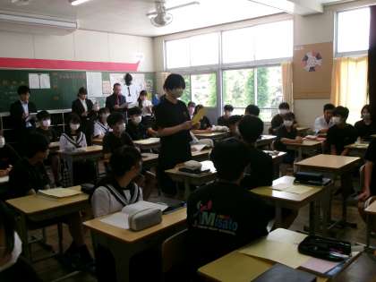 5月8日(水)、3年生のクラスで社会の研究授業を行いました。今回の授業は、美里中の教員が目指す授業づくりの提案授業となり、教員全員が参観しました。「資料の読み取りやグループ活動を通して、第二次世界大戦の1番の原因を予想しよう」という学習課題のもと、授業は進められました。生徒は、まず、Teamsで配られた3つの資料を個人で読み取り、第二次世界大戦につながる原因を予想し、次にグループ内で比較検討しました。その後、グループごとにまとめた考えをタブレットで記録し、全体で共有していました。