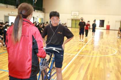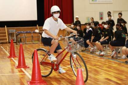 2年生が、豊田市交通安全センターから講師を招き、体育館で自転車講習会を実施しました。まずは、映像を使って、自転車の法的な位置づけや夜間の視認性と反射板の効果について学びました。続いて、実際に自転車を使って、自転車の点検の仕方を確認した後、傘をさしたまま・スマホを見ながら・イヤホンを付けたままの運転を代表生徒が行い、その危険性をみんなで実感しました。