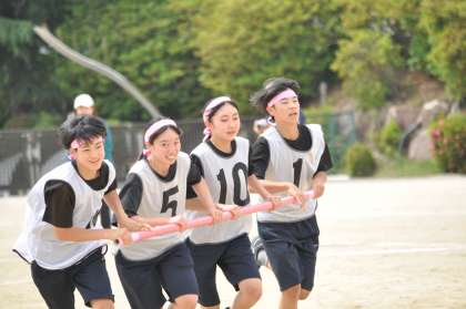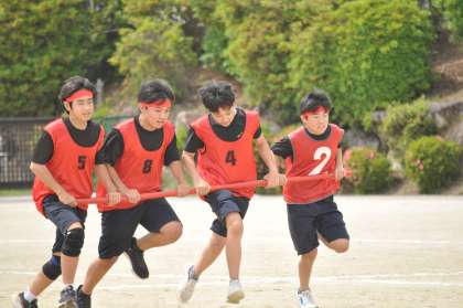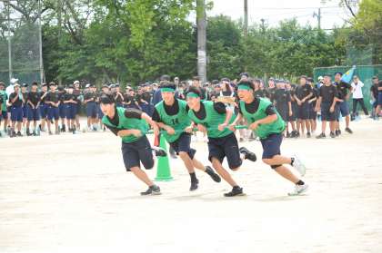 今日は予定を変更して、全学年、「台風の目」を実施しました。急な変更でしたが、生徒たちは一生懸命走り、跳び、くぐり、大きな歓声をあげて頑張っていました。指揮台での号令や審判、記録、アナウンスを任された生徒たちも、しっかりと責任を果たしていました。明日は、いよいよ台風の目以外の競技とパフォーマンスバトルに取り組みます。