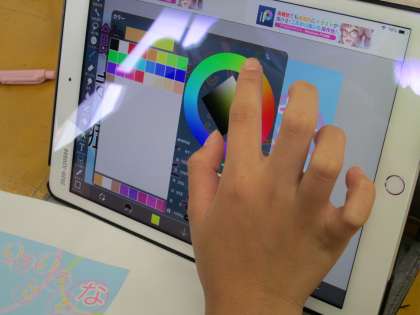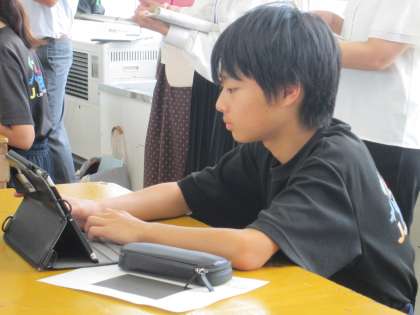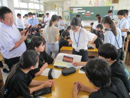 6月26日(水)、1年生のクラスで美術の授業実践を行いました。市の指導員を招いての指導訪問です。前時までにタブレットのペイントアプリで製作した各自の名刺をもとに、意見交流を通して、よりよいデザインを考えるという授業内容です。