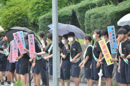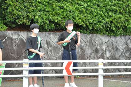 生活委員と呼びかで集まったボランティアの生徒が、今朝、西門近くの交差点付近に立って、交通安全の呼びかけを行いました。今日は、1・2年生の生徒が参加しました。明日は、3年生も加わって実施します。