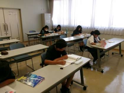 8月2日より、地域学校共働本部主催の自習教室が実施されています。希望者は交流館で学習に取り組みます。共働本部の呼びかけに応えてくださったボランティアの方々が、生徒たちの見守りをしてくださっています。