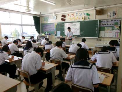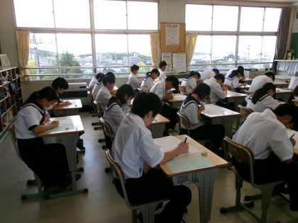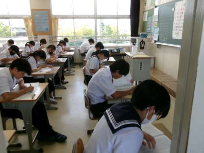 今日から3日間、期末テストを実施しています。生徒たちは9教科のテストに取り組み、給食を食べて下校となります。