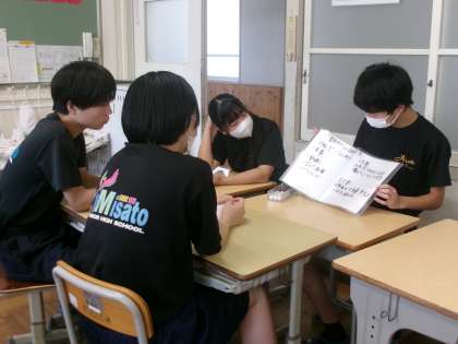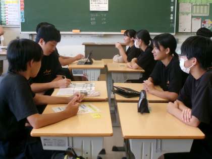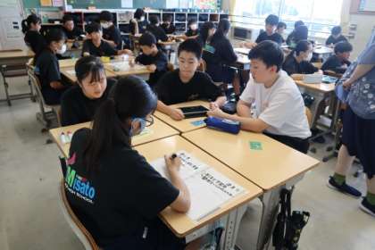 水曜日の朝のミサトーク。今日は、生徒会役員がテーマを決めて、全クラスに提示しました。「タブレットの使い方の現状と決まりについて」、グループで話し合い、代表者が他のグループへ移動して、自分たちのっグループの意見をを伝えていました。