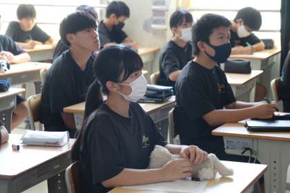 本日の5・6時間目に、生徒会役員選挙を行いました。立候補者が27人と多く、気温が高いため、オンラインで演説や選挙の注意事項を聞くスタイルとなりました。立候補者は、地域ルームで、自作のパワーポイント資料を使いながら公約などを堂々と話していました。他の生徒は、各教室でメモを取りながら演説を聞いていました。