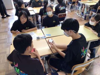 1・2・3年生混合の4〜6人班でミサトークを行いました。お題は「理想の学校を作ろう」。司会やプレゼンター、インタビュアーなどを2・3年生が務め、1年生をリードしながら話し合いを進めました。班で「まなボード」にまとめた意見は、タブレットで撮影し、生徒会役員が集約します。活発な話し合いの様子が見てとれるものは昼の放送で紹介し、学校生活の見直しに生かせる内容は今後の検討材料にします。