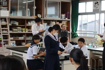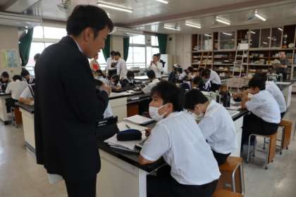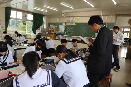 市の研究員を務める本校の先生が、2年生のクラスで研究授業を行いました。「人体マップを完成させ、ミサトノーベル賞を決めよう」という学習課題で授業は進められました。生徒たちは、タブレットで教育用アプリの「パドレット」を使用し、項目ごとにまとめられた各自のレポートを自由に閲覧し、仲間が調べた内容を共有して、各自で「人体マップ」を作りました。授業を参観された市教育委員会の指導主事と理科の教科指導員の先生からは、「一人一人の生徒が、よく調べてレポートをまとめ上げているのに感心しました」という感想をいただきました。