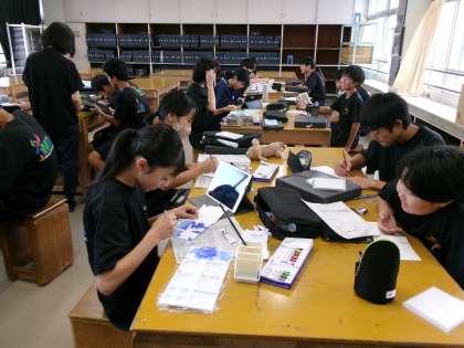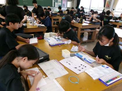 1年生の美術の授業では、「合唱曲のCDジャケットを作ろう」という活動をしていました。生徒たちは、ポイントを押さえてきれいに色塗りをしていました。合唱で頑張っている今だからこそ、活動にも力が入っているようです。