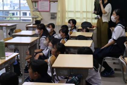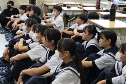 他学年の教室を訪ね、歌い合わせが行われています。1年生は、3年生の歌声を真剣な様子で聴いています。歌い終わると、お互いに感想を伝え、先輩から後輩へアドバイスがおくられていました。
