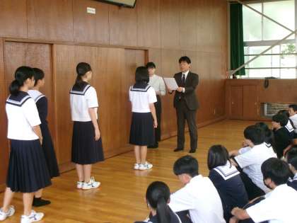 先週金曜日に実施した合唱コンクールの閉会式では、最優秀賞を獲得したクラスの表彰を行いました。今朝、学年集会にて優秀賞と優良賞のクラス、最優秀指揮者賞と最優秀伴奏者賞の生徒を表彰しました