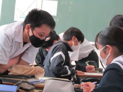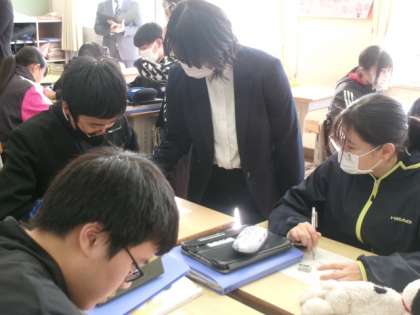 11月21日(木)、3年生のクラスで数学の研究授業を行いました。相似の性質を使って、三角形の高さや面積を求める問題にチャレンジ。仲間と意見交換しながら、真剣に問題と向かい合っていました。