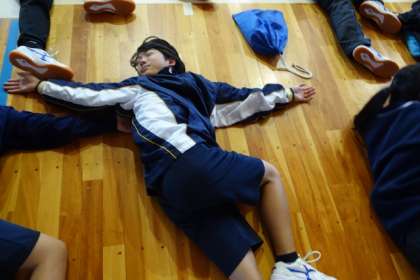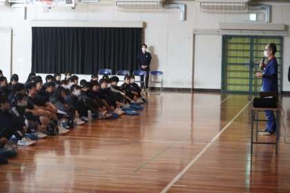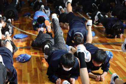 吉田整形外科病院の理学療法士の方々を講師に、姿勢について教えていただきました。姿勢が悪くなるのは、スマホやタブレットの使用が原因になることや、正しい姿勢のポイントを学びました。後半は、姿勢がよくなるためのストレッチを、生徒たちが実際に楽しく行いました。