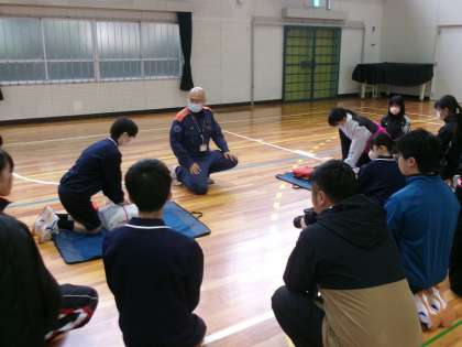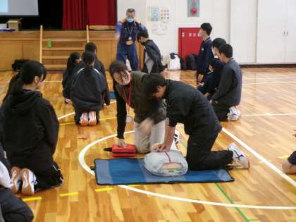 2年生が体育の授業でAED講習に臨みました。講師として消防署員さんなどをお招きし、分かりやすく指導していただきました。