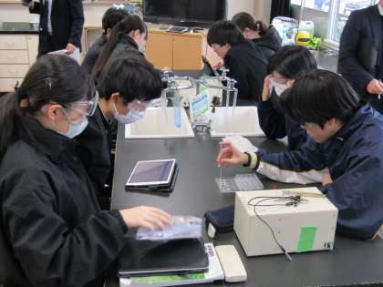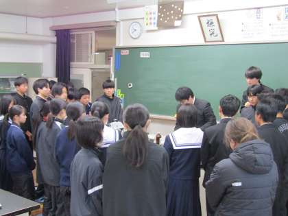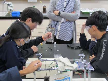 3年生のクラスで理科の研究授業を行いました。生徒たちは、実験を通して、酸性とアルカリ性の水溶液がもつ性質を見つけていました。