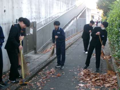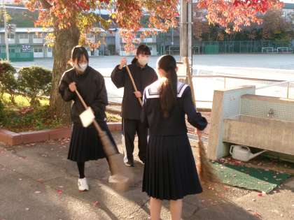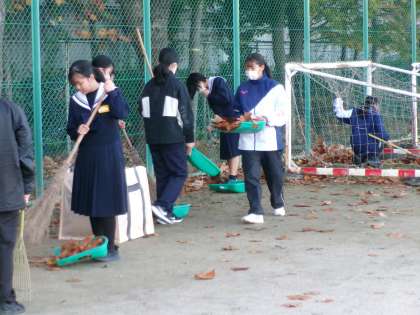 11月28日(木)7:40から、外周クリーン活動を行いました。この活動は、生徒会役員が発案・起案し、各クラスの議員がクラスの生徒たちに呼びかけて、ボランティアを募集して実現しました。1年生が校内、2・3年生が外周の落ち葉を拾い、ずいぶんきれいになりました。