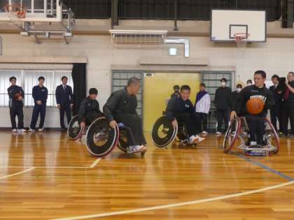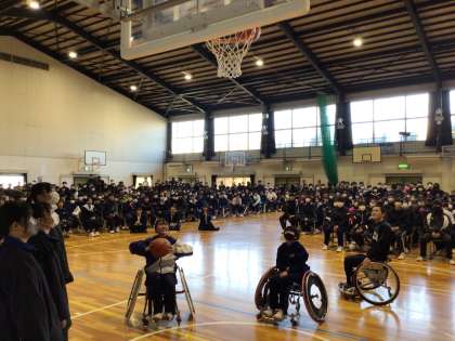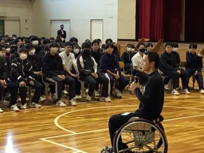 12月1日(月)5時間目、全校で人権集会に臨みました。講師は、車椅子バスケットボールチーム「ワールドバスケットボールクラブ」に所属する竹内さんにお願いしました。まずは、競技用の車椅子を6名の生徒が実際に操って、竹内さんと一緒にシュートなどを体験しました。その後、車椅子バスケットボールとの出会い、車椅子を使用している方からの視点、スポーツ選手への誹謗中傷についてお話をしていただきました。