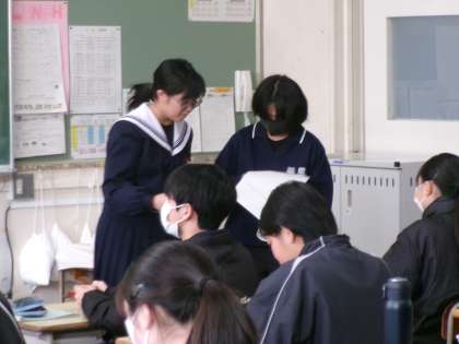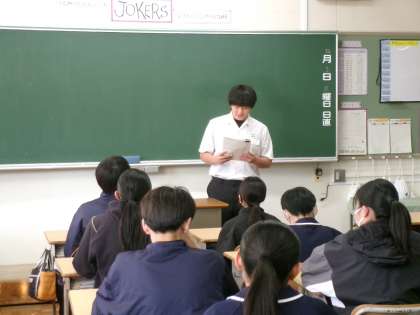 1・2年生が、3月に行う「卒業を祝う会」に向けて活動を開始しています。今朝は、2年生の代表が3年生の教室を訪れ、エピソード劇で扱う出来事についてアンケート調査をお願いしていました。
