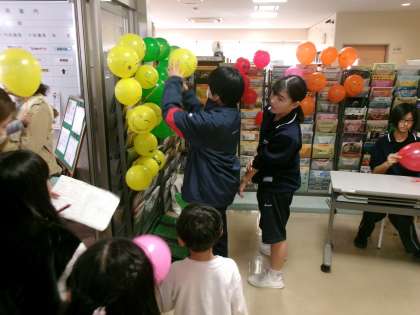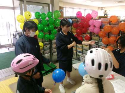 12月7日(土)の午後、野見小の児童が、国道301号御立8信号から泉2信号とその周辺の店舗・事業所をめぐる「文字探しウォーキング」が行われました。本校には、美里交流館で児童に渡す風船を膨らまし配布するボランティアの要請がきて、3名の生徒が参加しました。