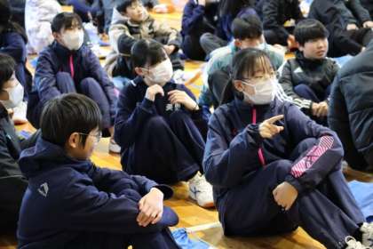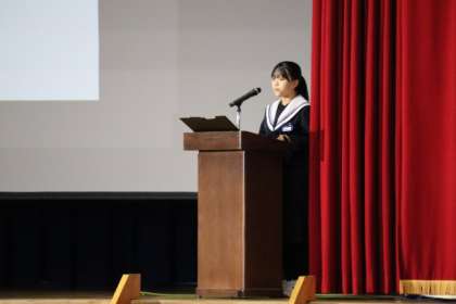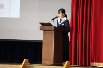 今年度、アメリカとイギリスに海外派遣生として渡航した2名が、全校生徒の前で報告会を行いました。パワーポイントの資料をスクリーンに映し、すべて英語でスピーチしました。自身の研究テーマについて、フォストファミリーとのふれあい、派遣事業を通し学び感じたことなどを話してくれました。