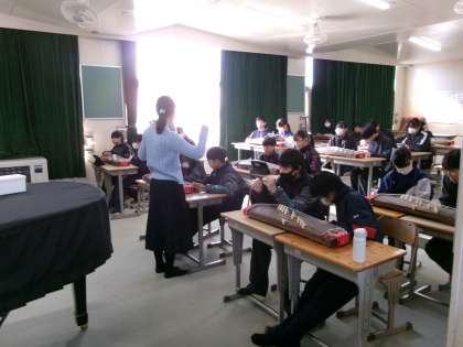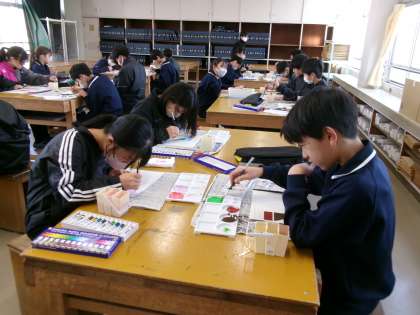 2年生の美術は、「水の量を調整してきれいに平塗しよう」という学習課題のもと、生徒たちは水の量に気を付けて絵具をとき、筆を使い分けて平塗りに挑んでいました。1年生の音楽では、筝にチャレンジ。生徒たちが演奏する筝は、数年前、地域の方からの寄付で購入したものです。ありがとうございます。1年生の技術では、「オリジナル木工製品づくり」を行い、生徒たちは釘での接合や表面の仕上げに取り組んでいました。また、3年生の技術は「プレートペンスタンド」の完成を目指し、金切り糸のこ、電動糸のこ、やすりを使って、材料の切断・成型をしていました。