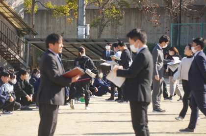 1月17日(金)、休み時間に避難訓練を実施しました。今回は、いつ行うかを生徒に伝えませんでした。急に避難をしなければならない場合でも、安全や周りの状況を確認し、適切な判断や行動をとれるようにすることがねらいです。阪神・淡路大震災から30年。「天災は忘れた頃にやってくる」と昔から言われますが、昨今の様子から「天災は忘れる前にやってくる」もしくは「天災は立て続けにやってくる」感覚があります。生徒たちには、火事はすべてを焼き尽くして多くの人を巻き込む危険性があること、報道などで伝えられる震災から日本人が学んだことを、自分事としてとらえてほしいと伝えました。