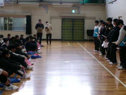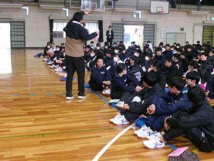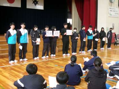 2年生が、自然教室に向けての学年集会を行いました。係活動や立志式について、担当の生徒や先生から説明を聞きました。