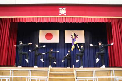 予行練習の前に、旗手の引継ぎ会を行いました。入学式や卒業式などの冒頭には「校旗登壇」があり、旗手が堂々と校旗を壇上に飾ります。3年生の旗手の皆さん、今までありがとうございました。2年生の旗手の3人、これからよろしくお願いします。