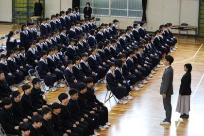 3月5日(水)、1・2時間目に予行練習を実施しました。入場から退場まで、通して行いました。3年生の卒業の歌は後輩に初披露となり、素敵な歌声を響かせました。練習の様子を見ていると、咳き込む人が増えているように思います。体調管理に十分気を付けて、卒業式に臨んでください。