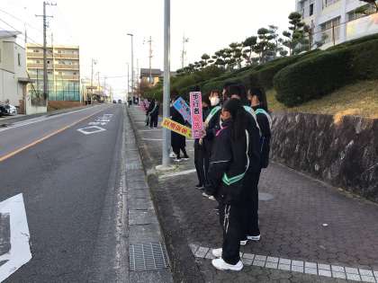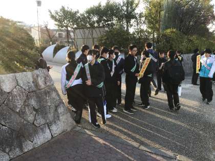 12/1(月)、朝の交通安全運動を行いました。その後、8:15より体育館にて海外派遣生徒2名による報告会を行いました。