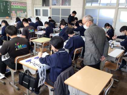 12/8(月)、講師の方を招いての書写指導(3年生)の風景です。